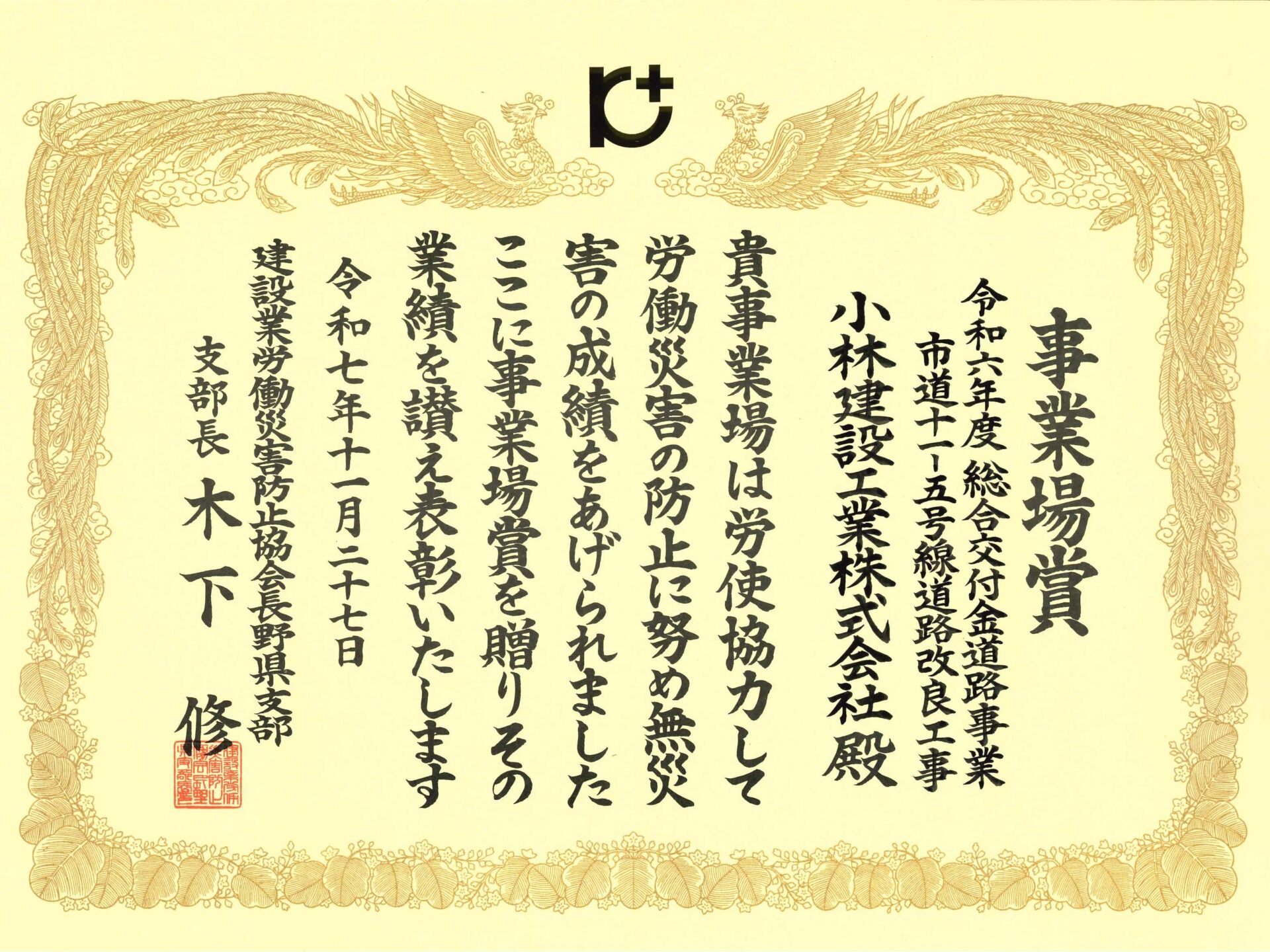 この度、労働災害防止への取り組みと無災害の成績が評価され、「事業場賞」を受賞いたしました!
