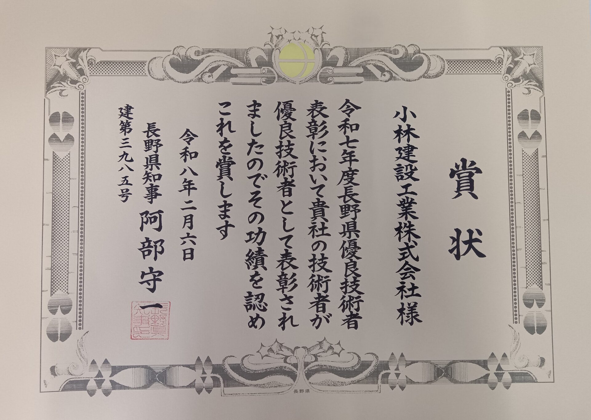 この度、「令和7年度長野県優良技術者表彰」において、弊社の技術者がその功績を認められ、栄えある賞をいただくことができました。